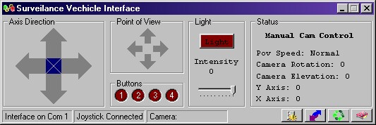 The interface program shown bellow is used to control camera movement, head light, speed and steering. The program also can be set up to run camera sweep in any direction.
