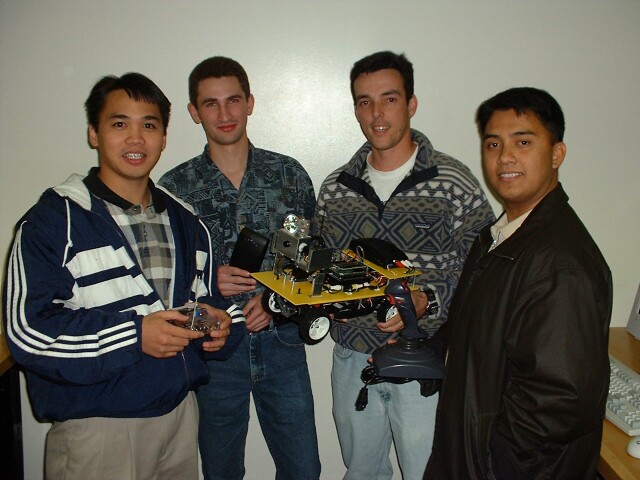 The vehicle is controlled remotely by a computer through joystick, mouse, or keyboard. The control signal is send using RF modem. The audio/video reciever is connected to computer's video capture card.  The feed is displayed on computer screen.  You can see the vehicle, RF modem, and audio/video receiver bellow.